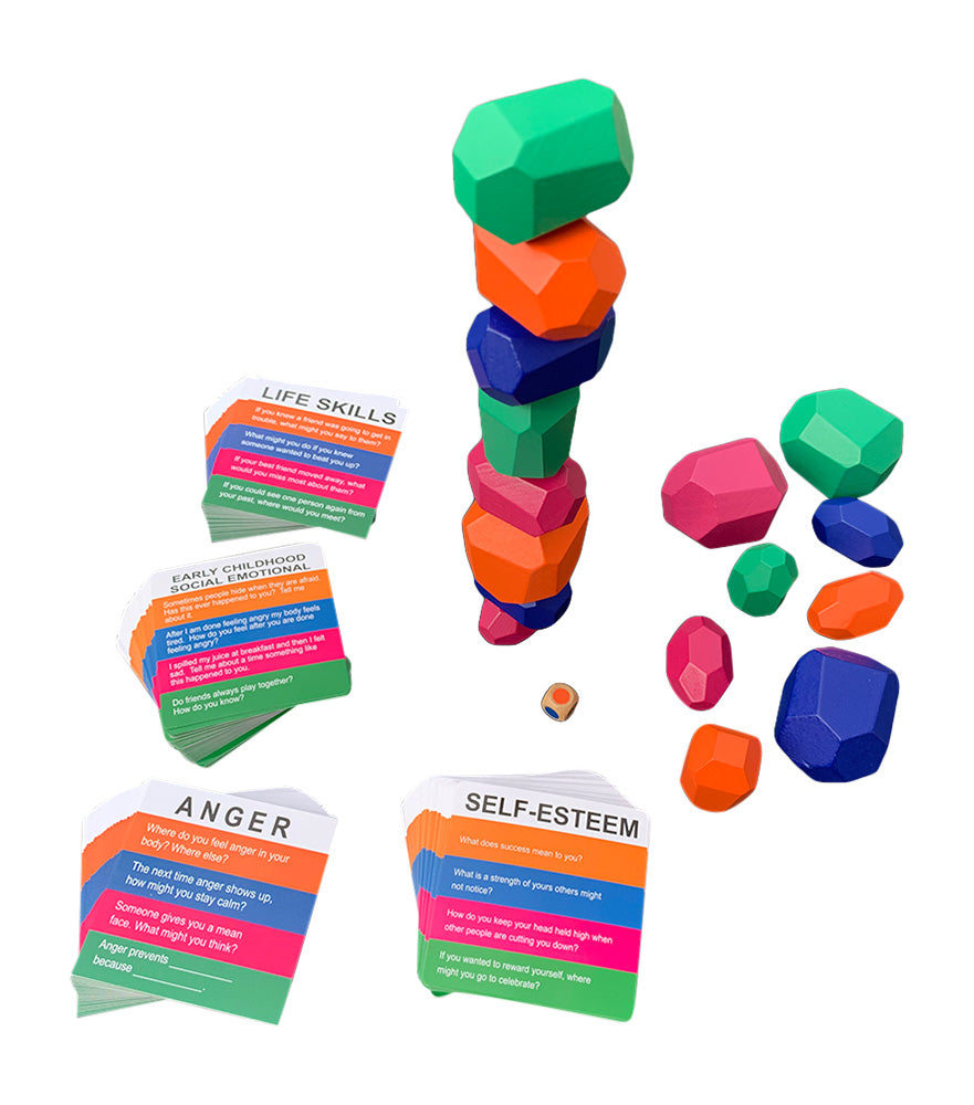 Four card decks, each with over 150 questions, including Self Esteem, Life Skills and Anger for ages 8 and up plus the Early Childhood Social Emotional deck for ages 4-7. The drawstring game bag holds all four decks, the 16 Kohatu stones plus a game dice. Choking hazard not appropriate for under age 3.